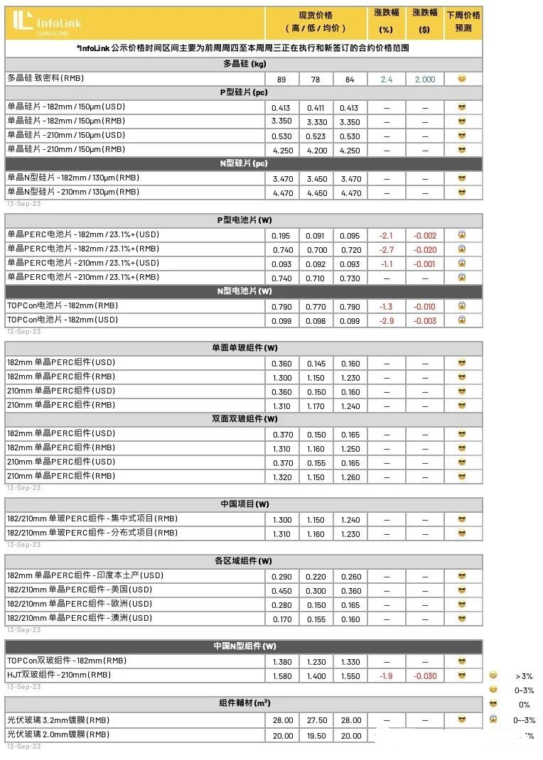 需求方面,9月国内走单稳健,暂时并无爆发式增量的迹象,前期调价过低的价格近期也出现无法交付的局面,部分业主考虑重新招标,恐将影响部分项目拉动,9-10月需求仍是看好小幅上升。海外欧洲近期现货价格降价幅度开始收窄,订单也开始小幅度回温,释放信号库存正在滚动消化,但仍需要注意9-10月组件排产及出口状况,库存仍需视需求走单情况观察。美国需求受惠大型项目拉动仍有所增长,然分布式需求仍受到利率影响较为疲软。