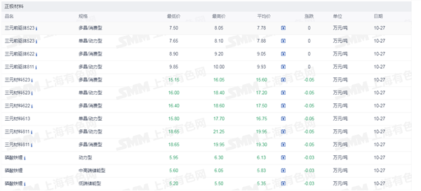 证券之星新能源车行业周报:据上海有色网,截止10月27日,电池级碳酸锂16.10- 17.30万元/吨,均价16.70万元/吨,环比上一工作日下滑0.10万元/吨;工业级碳酸锂15.4-16.2万元/吨,均价15.80万元/吨,环比上一工作日下滑0.10万元/吨。目前市场整体看跌情绪依旧浓重,下游企业仍以长协为主,零单采买意愿平淡,部分贸易商,盐厂出货压力较大,挺价心态动摇,价格小幅走低。