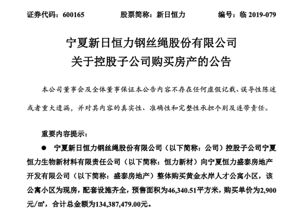 中科新材当时买下这批房产,主要是为了方便员工使用。公告显示,当时中科新材(恒力新材)5万吨/年月桂二酸项目在当地建设。根据项目建设用工需求,需在经开区及经开区以外招聘员工。为吸引和留住人才、方便员工的统一管理、促进项目早日达产、达效,恒力新材向盛泰房地产整体购买了该小区。