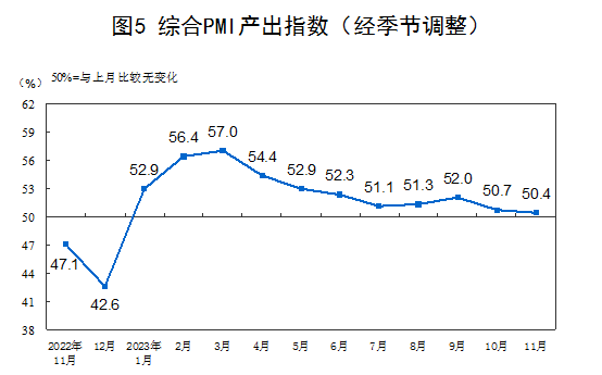 11月份,综合PMI产出指数为50.4%,比上月下降0.3个百分点,表明我国企业生产经营活动总体持续扩张。