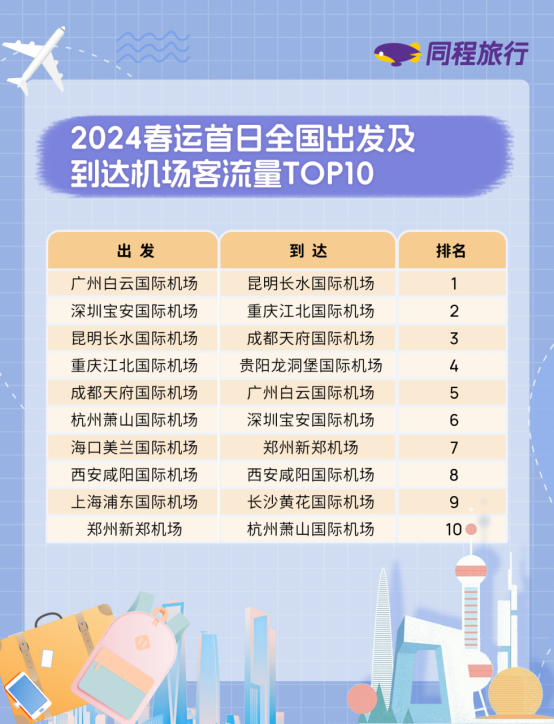春运首日,全国主要城市机场的客流量也明显增加。同程旅行春运出行大数据显示,1月26日当天全国范围内出发客流量较大的机场主要有:广州白云国际机场、深圳宝安国际机场、昆明长水国际机场、重庆江北国际机场、成都天府国际机场、杭州萧山国际机场、海口美兰国际机场、西安咸阳国际机场、上海浦东国际机场、郑州新政机场等。客流量较大的到达机场主要有昆明长水国际机场、重庆江北国际机场、成都天府国际机场、贵阳龙洞堡国际机场等。整体上,春运首日全国民航热门航线的客流方向与铁路热门线路高度一致。