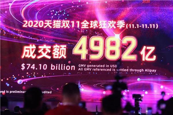 在浙江杭州未来科技城学术交流中心,大屏幕显示阿里巴巴旗下天猫“双11”成交额超过4982亿元(2020年11月12日摄)。新华社记者 黄宗治 摄