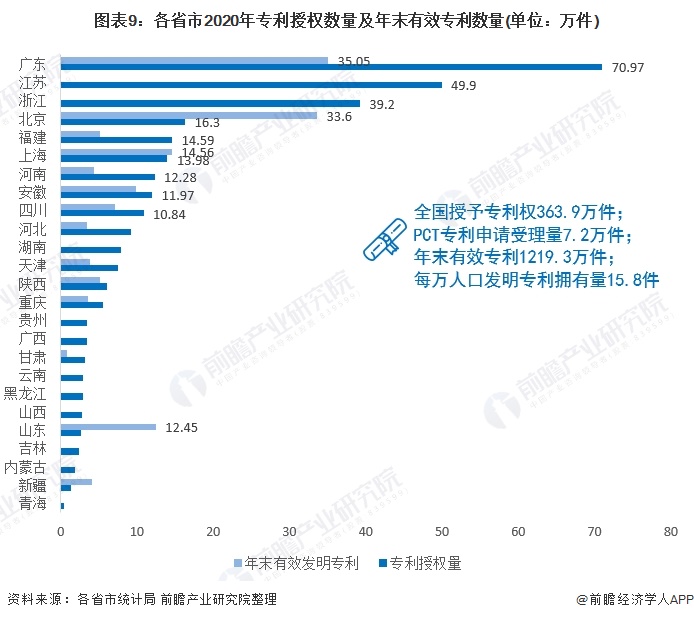 地区方面,2020年广东省专利授权总量70.97万件,比上年增长34.6%,居全国首位;其中,发明专利授权量7.07万件,增长18.3%。全年《专利合作条约》PCT国际专利申请量2.81万件,居全国首位。截至2020年底,全省有效发明专利量35.05万件,居全国首位。每万人口发明专利拥有量28.04件,远高于全国平均水平。
