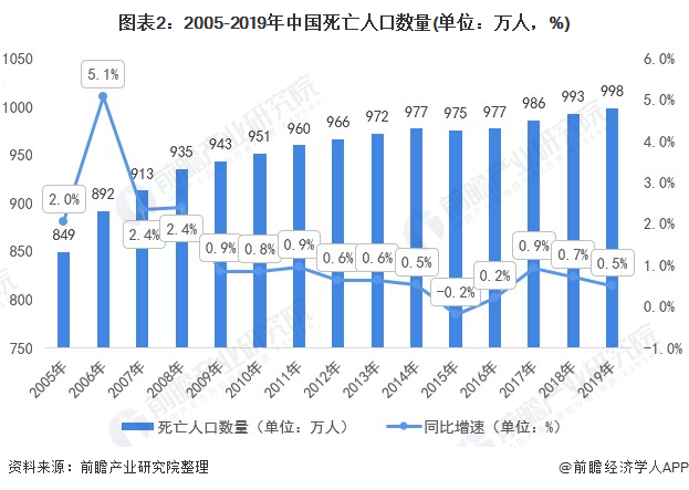 2005年以来中国人口死亡人数整体增速下降,2019年,中国死亡人数998万人,同比增速0.5%,同比下降0.2个百分点。