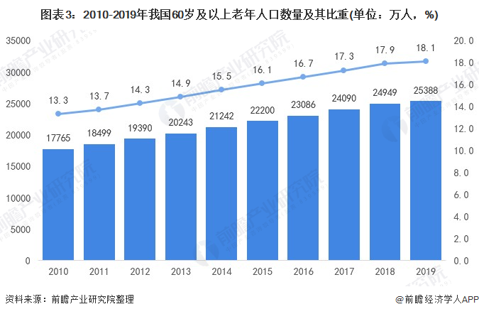 据国家统计局发布的2019年国民经济和社会发展统计公报显示,截至2019年底,全国60周岁及以上老年人口25388万人,占总人口的18.1%,其中65周岁及以上老年人口17603万人,占总人口的12.6%。国务院2017年1月印发的《国家人口发展规划(2016-2030年)》提到,2030年60岁以上老人占比将到达25%左右。