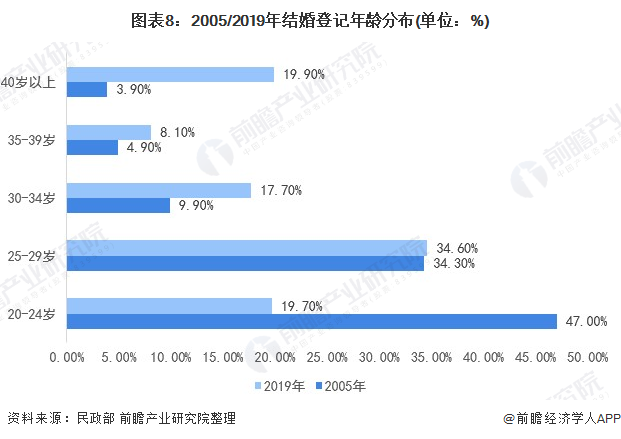 “晚婚”现象突出;25-29岁接替20-24岁人群成为新的结婚“主力军”,高年龄层段(40岁以上)结婚登记占比大幅上升。2005-2019年,20-24岁结婚登记人数(含再婚)占比从47.0%降至19.7%,25-29岁从34.3%升至34.6%,30-34岁、35-39岁、40岁以上结婚登记人数占比分别从9.9%、4.9%、3.9%增至17.7%、8.1%和19.9%。