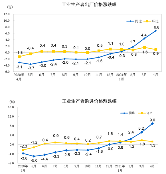 中国4月全国工业生产者出厂价格(PPI)同比上涨6.8%,涨幅为2017年以来最大,超过前值4.4%,环比上涨0.9%;工业生产者购进价格同比上涨9.0%,环比上涨1.3%。1—4月平均,工业生产者出厂价格比去年同期上涨3.3%,工业生产者购进价格上涨4.3%。