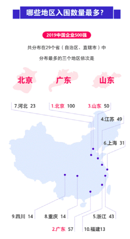 500强企业主要集中在沿海省份,四川、重庆挑起中西部地区的“大梁”。