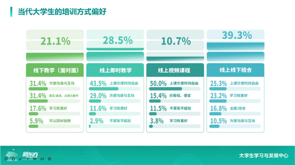 第二是师资力量和学生力量。师资方面,我们有1500+全职教师团队,其中海归、硕士背景的老师占比在90%以上。学生方面,过去一年新东方大学事业部总体的考研培训学员中,最主流的是大三学生,其次是三分之一的在职学生。在校学生以大三学生为主,占了我们用户群体的46%左右。这个学生群体总的池子,一年大概三十万付费用户。学习方式上,越来越多变成了线上+线下融合的方式。