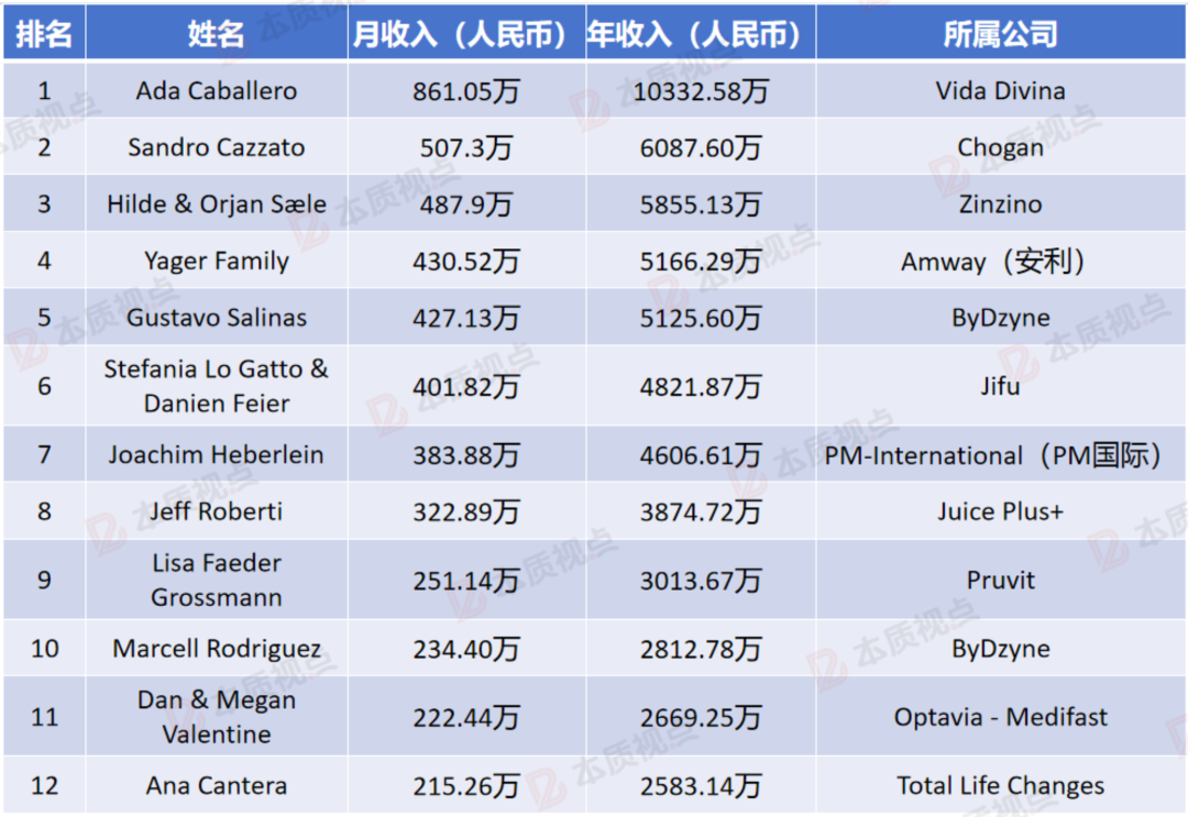 令人意外的是,排在榜首的是一家名不见经传的美国公司Vida Divina旗下直销商Ada Caballero,其以10332.58万元的收入傲居群雄,这也是唯一一位年收入过亿元人民币的直销商。本质视点查询了解,Vida Divina是一家2016年才成立的公司,主营保健品。