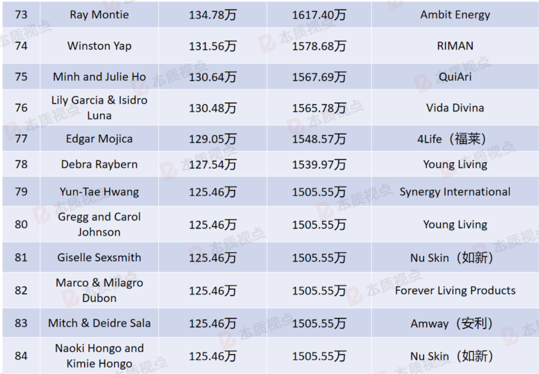 该榜单最后一名是来自立新世纪的Daniel Mueller,他以1290.47万元的年收入排名垫底,这也是所有上榜人员的最低收入。按照这个收入标准,应该有一些中国顶级直销商也能进入该榜单。
