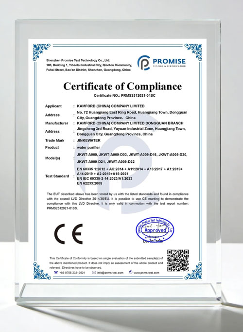 2025年12月22日,金科伟业(中国)有限公司旗下金科沃特品牌JKWT-A009系列五款净水器顺利获得欧盟CE认证,标志着公司产品在安全、性能、品质等方面达到欧盟国际标准,成功敲开欧洲市场大门,彰显了公司产品的硬核实力。