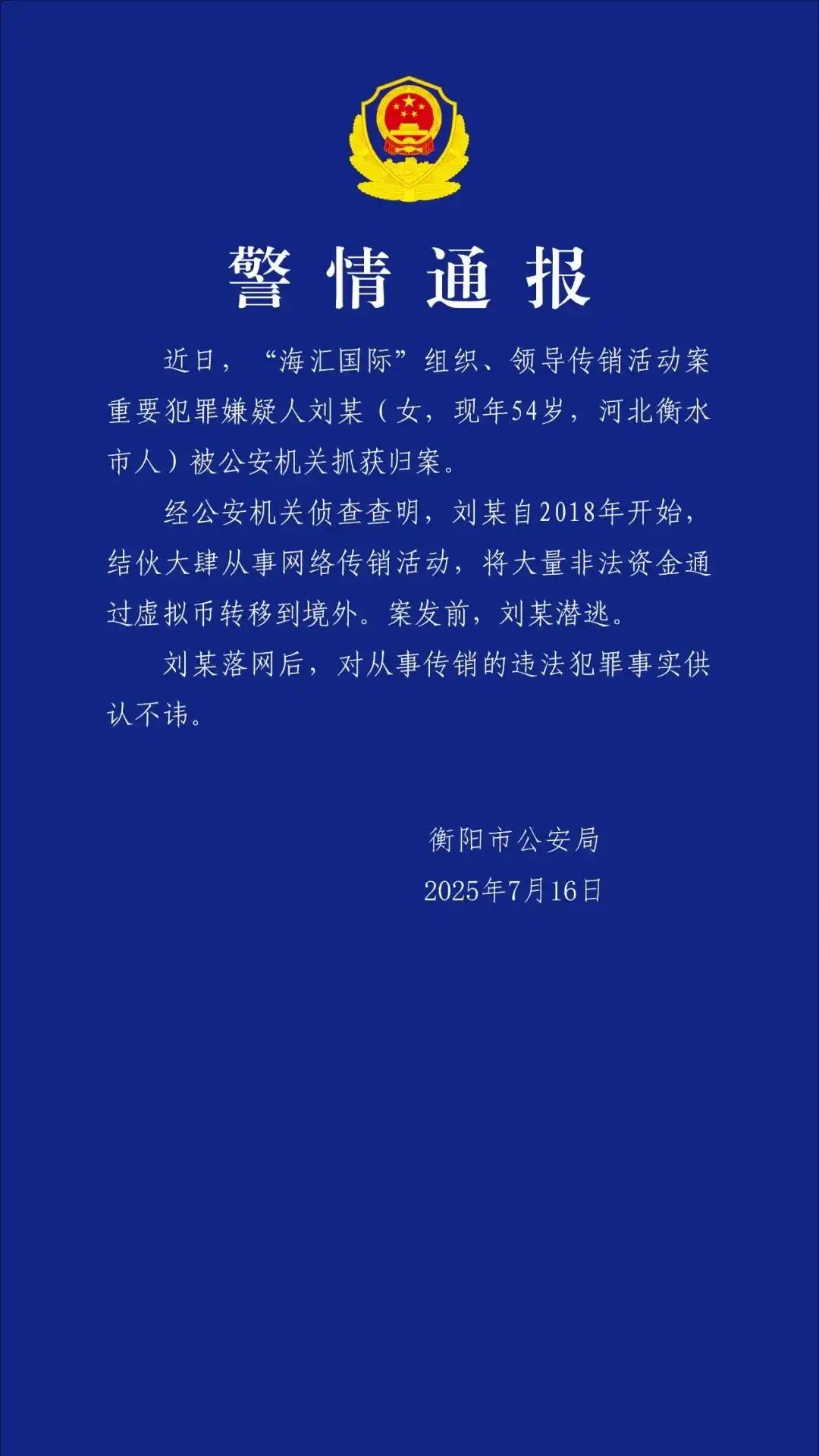 ●衡阳警方:海汇国际传销案重要犯罪嫌疑人刘某被抓获归案